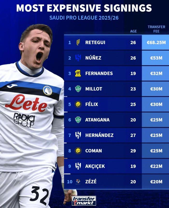 随着沙特联赛转会窗口的关闭,德转公布了2025/26赛季沙特联赛最昂贵的引援前十排行榜。利雅得新月独占三席,利雅得胜利和吉达国民各占两席紧随其后。以下是完整榜单:1. 雷特吉(26岁):亚特兰大->卡迪西亚,6825万欧2. 努涅斯(26岁):利物浦->利雅得新月,5300万欧3. 罗杰-费尔南德斯(19岁):布拉加->吉达联合,3200万...